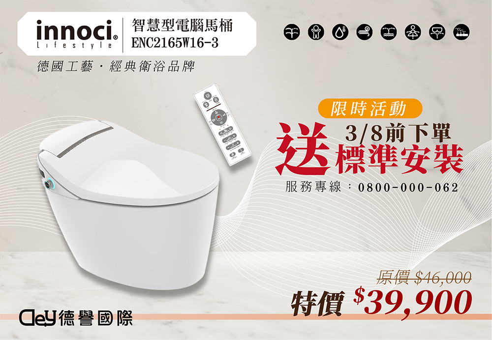 【限時活動】3/8前下單innoci電腦馬桶-ENC1265W16-3,送標準安裝!